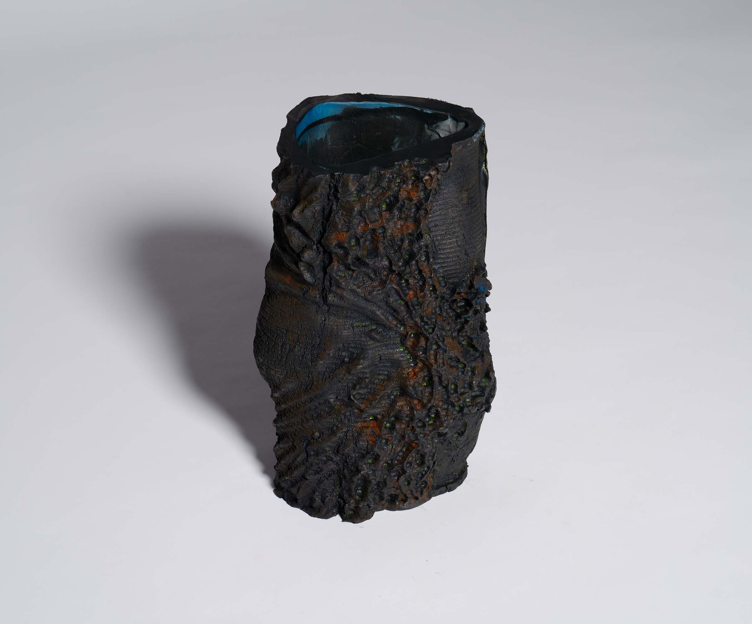 Using digital fabrication techniques, particularlly 3D Modelling and Computer Numerical Control (‘CNC’) milling, I create plaster molds derived from these ‘landscapes’ , allowing me to transfer these detailed textures into the clay body. These slab bodies are then variously manipulated to create objects which are both acccurate expressions of the original source material, and of the improvised act of assembly into vessels and other forms.